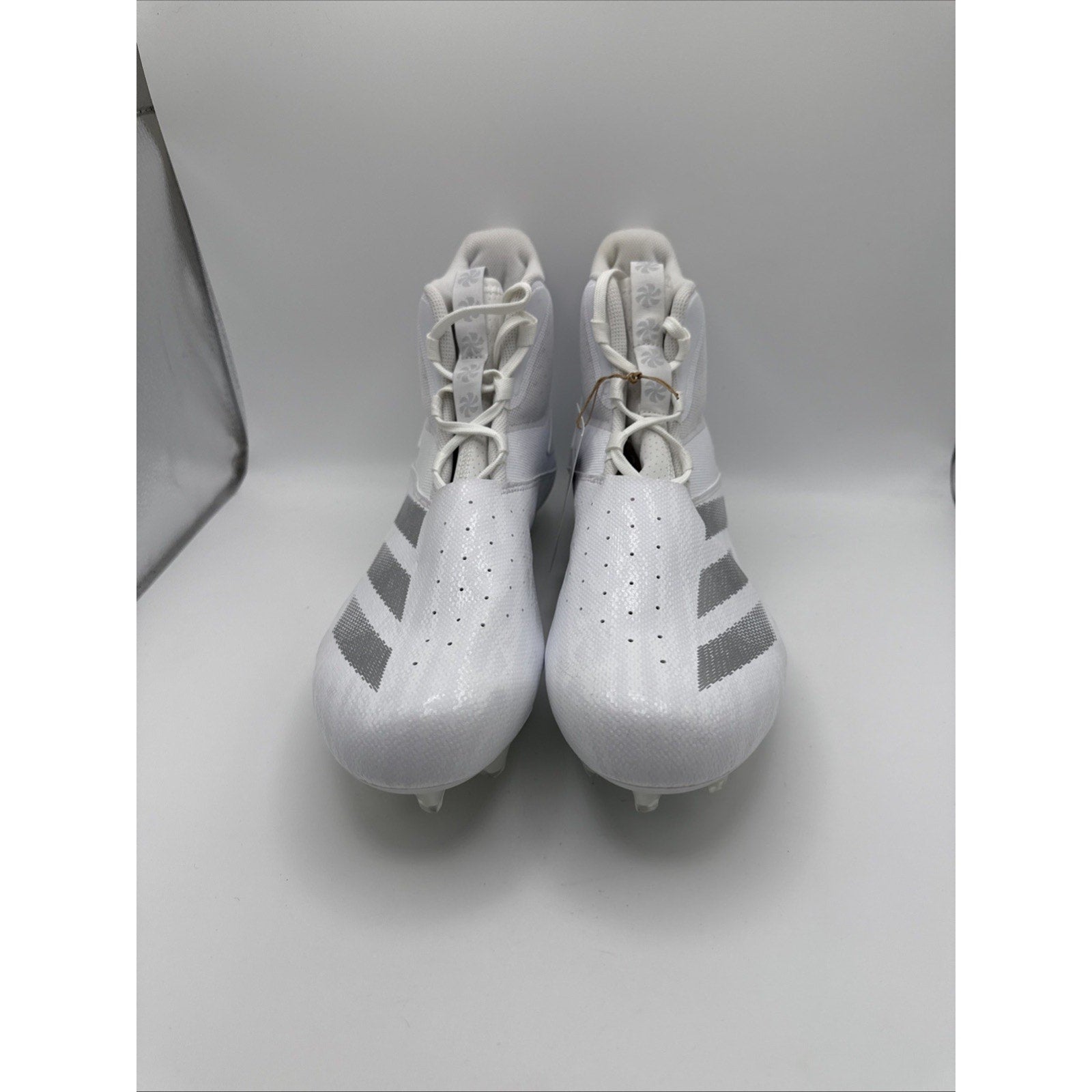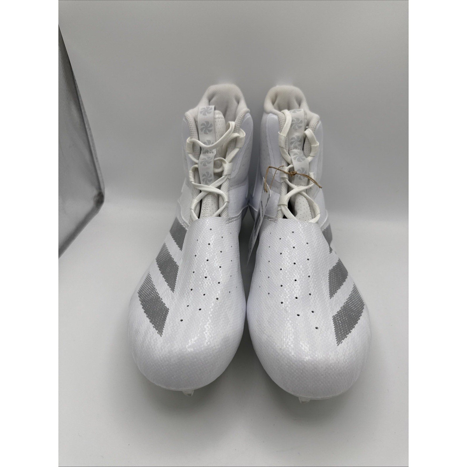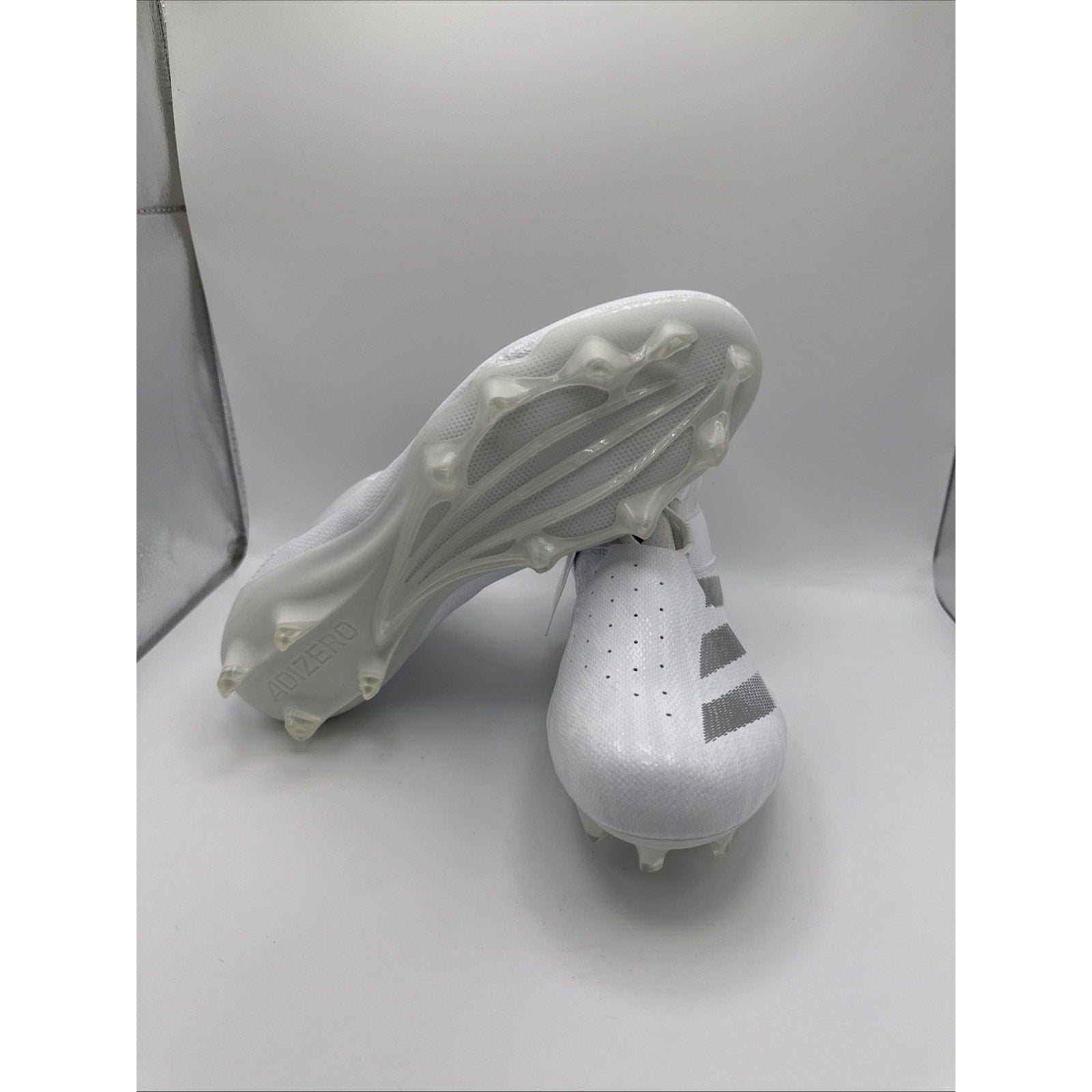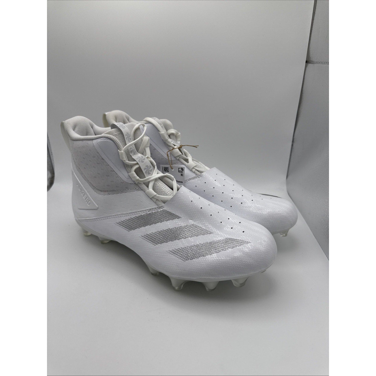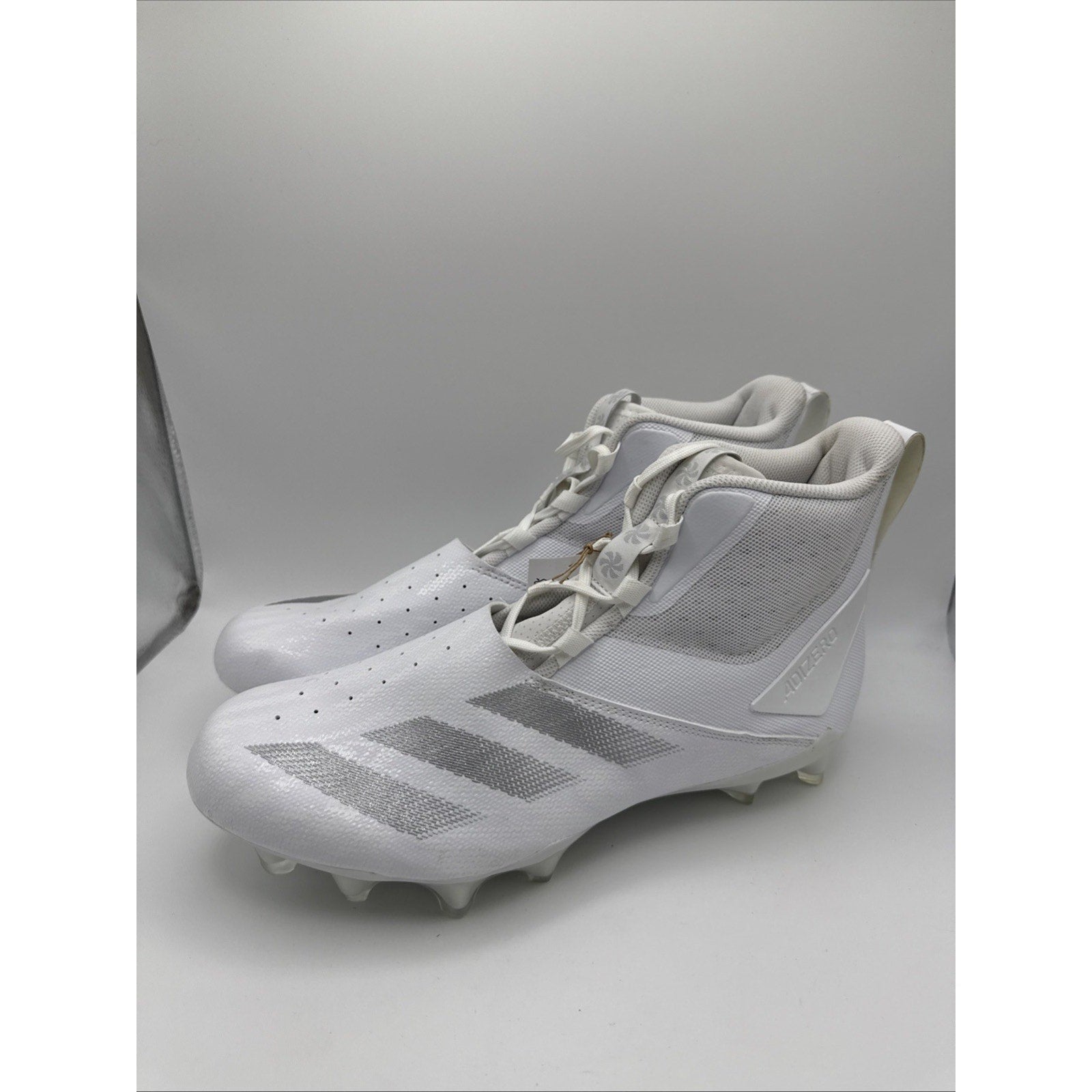 The product is a pair of Adidas Adizero Chaos Linemen football cleats in white, size 11. These cleats are designed specifically for football players, with a medium width for a comfortable fit. Manufactured in China, these cleats are of high quality and come with the iconic Adidas brand. Ideal for lineman positions, these cleats offer durability and support for athletes looking to perform at their best on the football field.