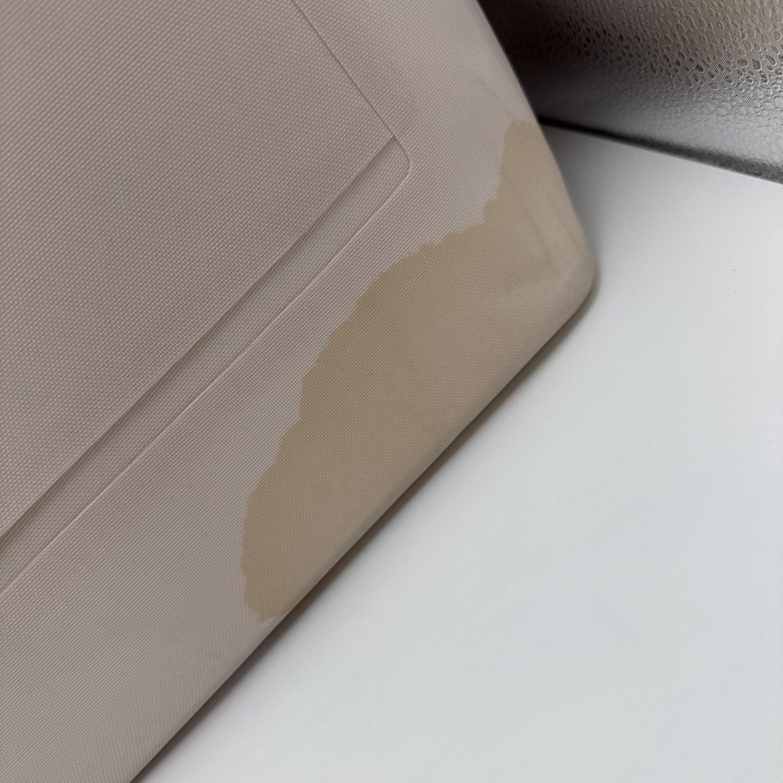 New with tags. Has stain on the button and side also a little dust dirty due to storage and transport. Everything else works perfectly. You may be able to get the stain out with some cleaning solution.